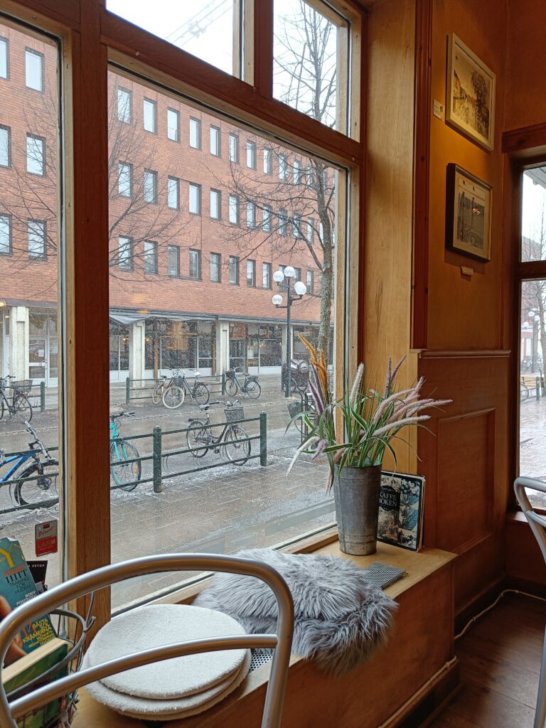 It’s snowing a bit in Umeå this morning, and I have somehow managed to find that one cafe which, on the upside, has pretty decent coffee, but somehow doesn’t have wifi? Feels like going back in time… a vibe amplified by the very 80s radio choices.